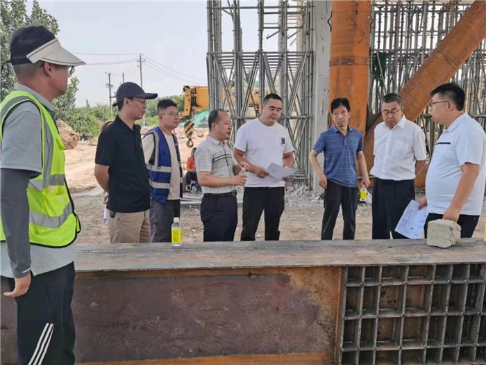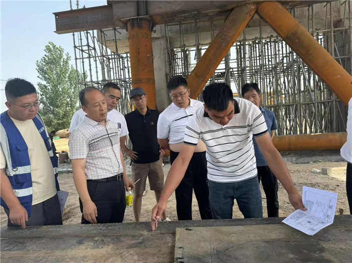 6月25日,市公路事業(yè)發(fā)展中心總工趙兵、養(yǎng)護(hù)科科長(zhǎng)張紅雁、趙志偉、總監(jiān)劉克輝及設(shè)計(jì)一行至S244線G209跨線橋改造項(xiàng)目,現(xiàn)場(chǎng)了解橋梁下部結(jié)構(gòu)及各分項(xiàng)工程施工情況,趙總要求橋梁鋼支撐頂升專(zhuān)項(xiàng)施工加強(qiáng)設(shè)計(jì)、施工安全系數(shù)及安全措施,并給出具體指導(dǎo)意見(jiàn)。